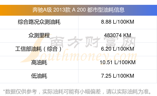 根据多位车主实测得出数据,该车型低油耗为7.25L/100km,高油耗为10.51L/100km,综合路况众测油耗为8.88L/100km,工信部综合油耗为6.20L/100km。