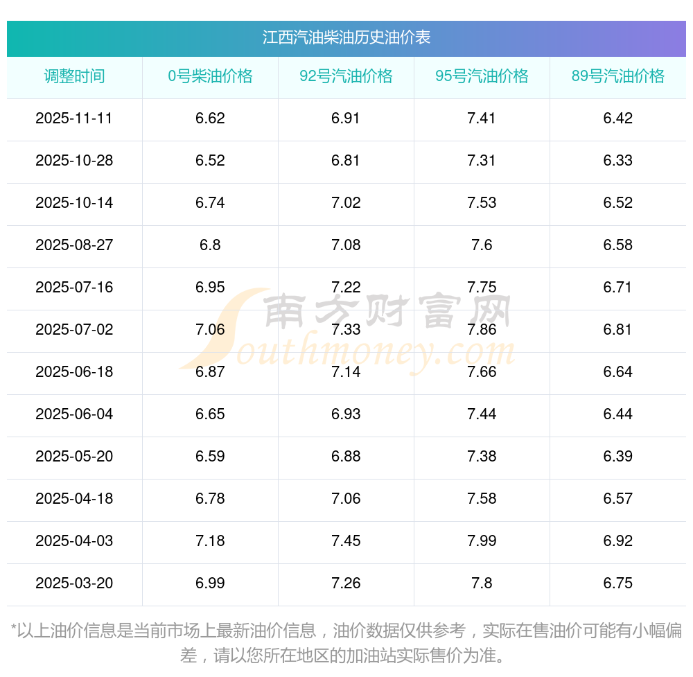 11月20日,江西95号汽油的价格是7.41元每升,本次的调整时间为11月11日,对比上次的调整上升了0.1元,上升1.368%,下次调整时间为11月24日24时,还有4.57天。