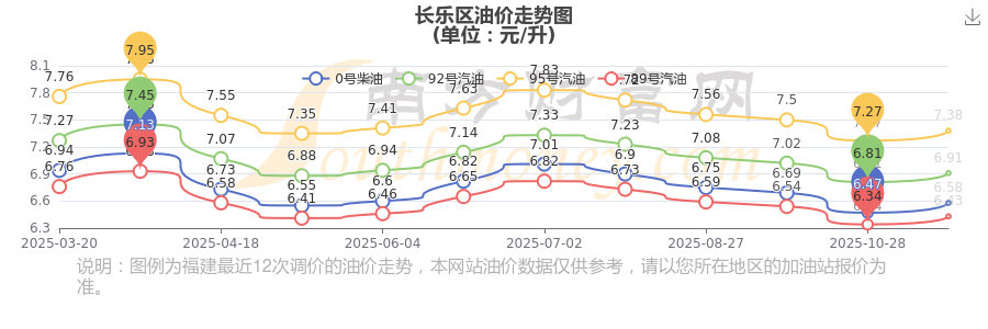 11月20日长乐区汽油、柴油的价格是11月11日调整后的价格,每升价格为:92号汽油为6.91元,升了0.1元,升幅达1.47%;95号汽油为7.38元,升了0.11元,升幅达1.51%;89号汽油为6.43元,升了0.09元,升幅达1.42%;0号柴油为6.58元,升了0.11元,升幅达1.7%。下一轮油价调整时间11月24日24时,距离现在还有4.57天。