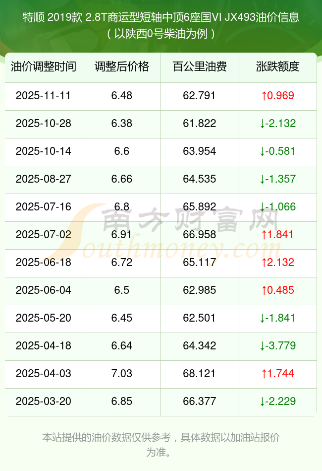 根据11月11日0号柴油最新调整价格6.48元/升来计算(以陕西为例),该车型每百公里的平均油费是62.791元,上一轮10月28日调整价格6.38元每升来计算,每百公里的平均油费是61.822元,对比上一轮多花0.969元,下一轮的油价调整时间是11月24日24时。