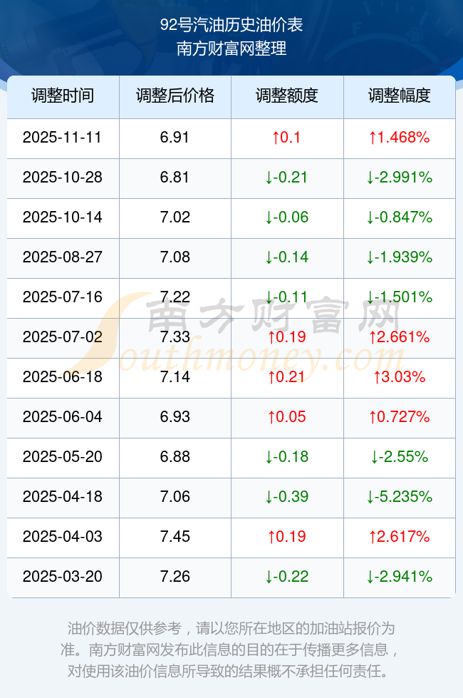 11月20日汽油、柴油每升价格:距离最近的油价调整时间是11月11日,92号汽油为6.91元,上涨了0.1元,上涨幅达1.47%;95号汽油为7.41元,上涨了0.1元,上涨幅达1.37%;89号汽油为6.42元,上涨了0.09元,上涨幅达1.42%;0号柴油为6.62元,上涨了0.1元,上涨幅达1.53%。下一轮油价调整时间11月24日24时,距离现在还有4.57天。