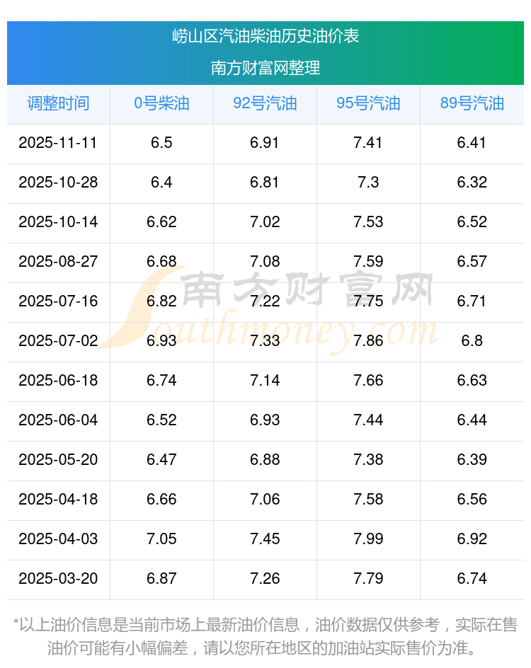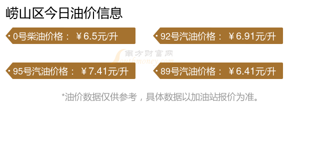 11月20日,崂山区汽油、柴油每升最新价格:本轮的油价调整时间是11月11日,92号汽油为6.91元,上涨了0.1元,上涨幅达1.47%;95号汽油为7.41元,上涨了0.11元,上涨幅达1.51%;89号汽油为6.41元,上涨了0.09元,上涨幅达1.42%;0号柴油为6.5元,上涨了0.1元,上涨幅达1.56%。