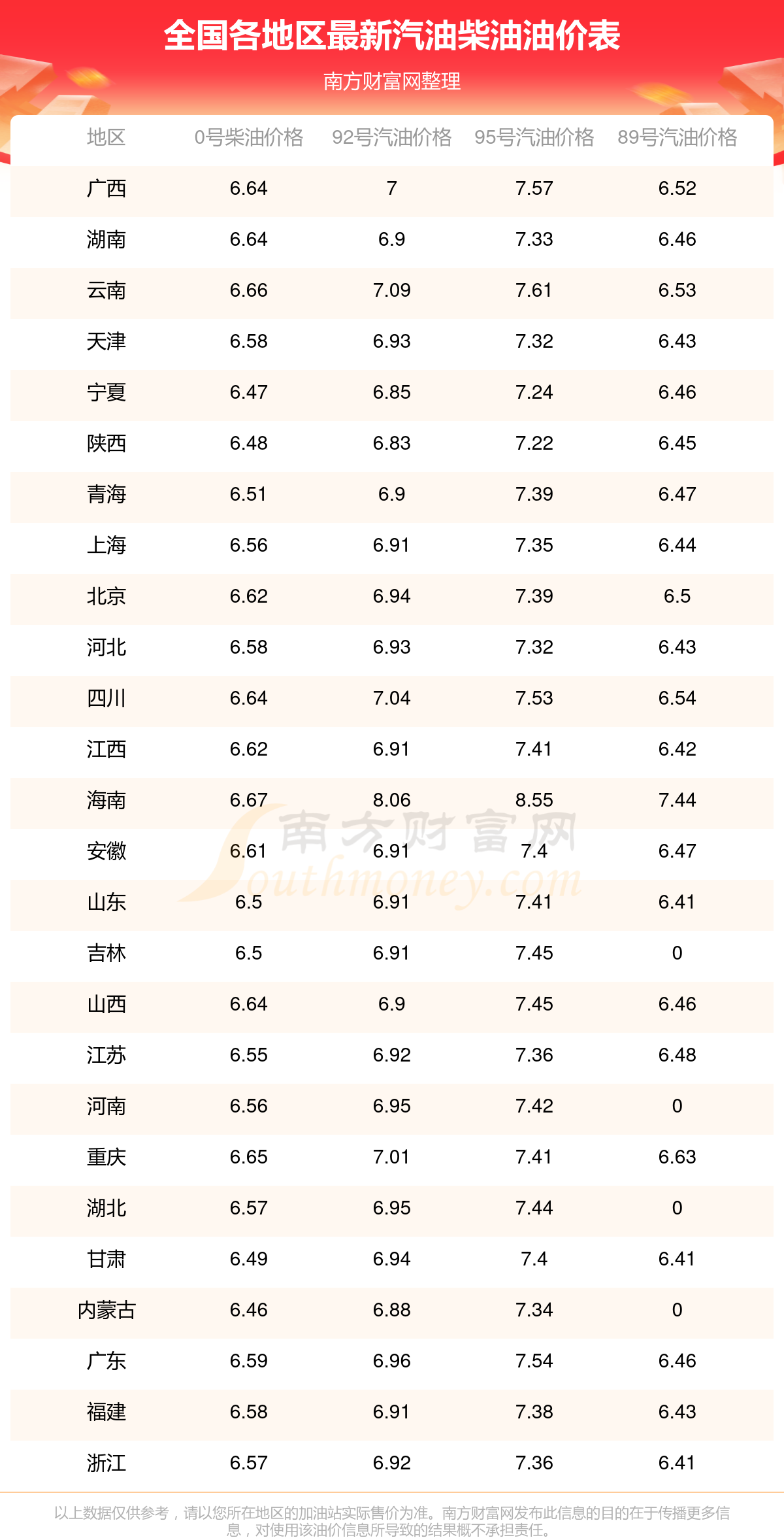 以上数据仅供参考,请以您所在地区的加油站实际售价为准。开云手机web版登录入口发布此信息的目的在于传播更多信息,对使用该油价信息所导致的结果概不承担责任。
