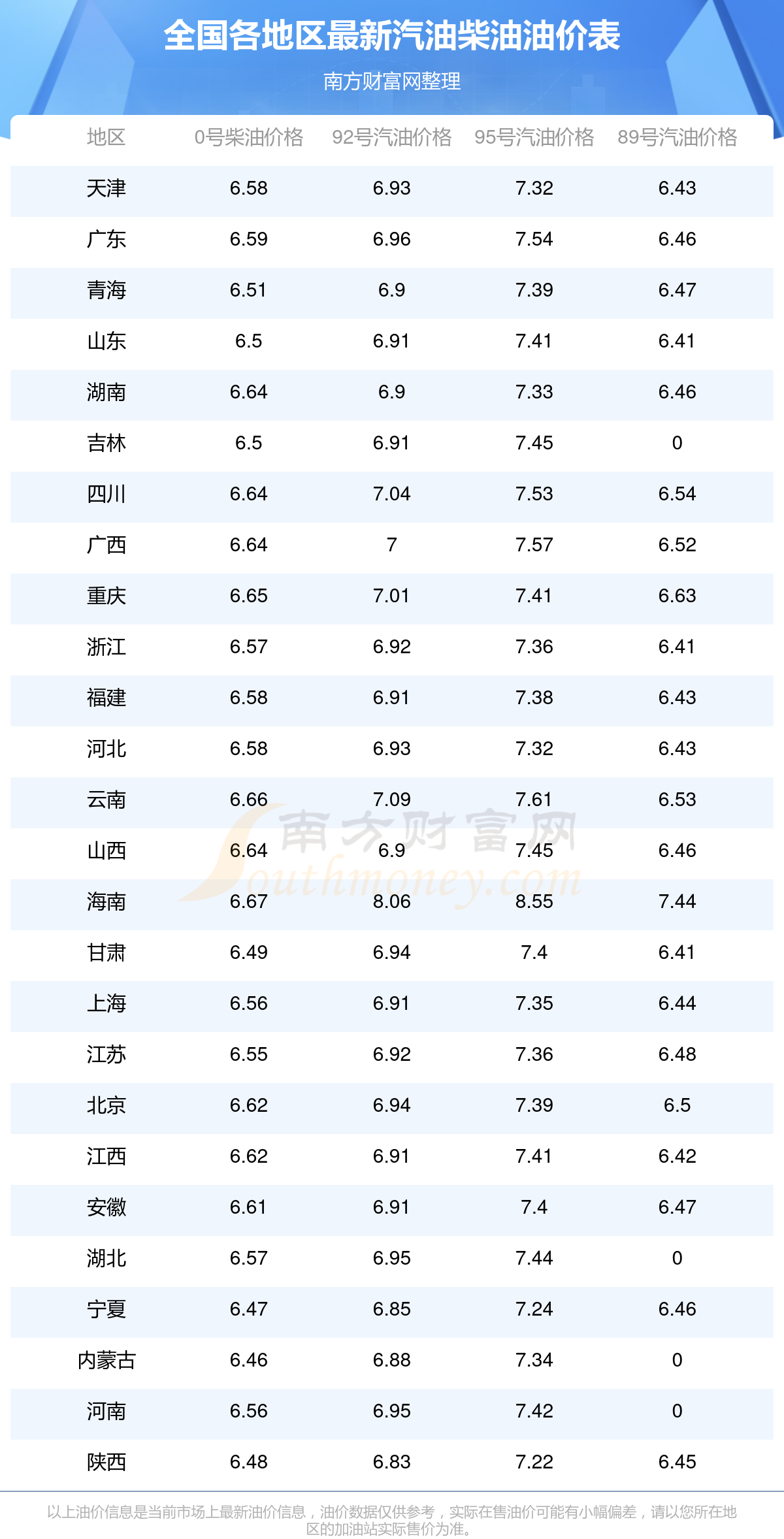 2025年11月20日全国各地油价调整及最新汽油价格表