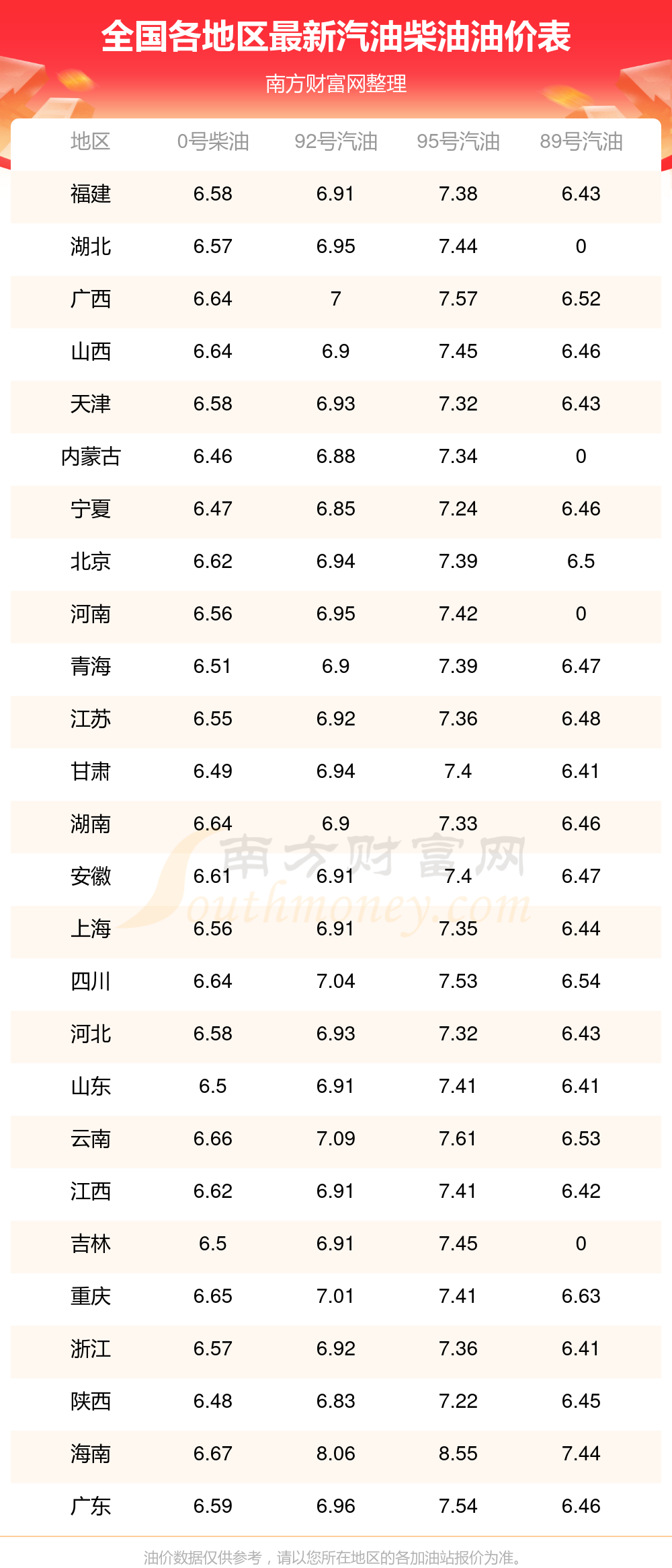 全国各地区最新油价表