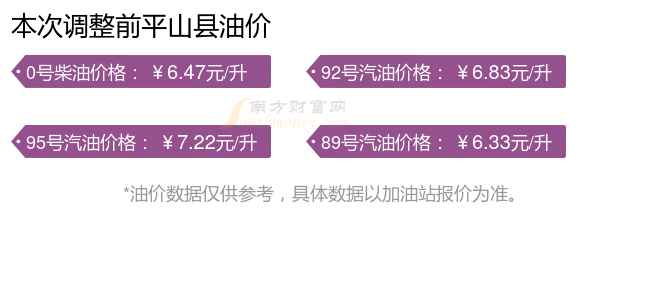 平山县汽油、柴油11月20日每升的价格(油价调整时间11月11日):92号汽油6.93元;95号汽油7.32元;89号汽油6.43元;0号柴油6.58元。
