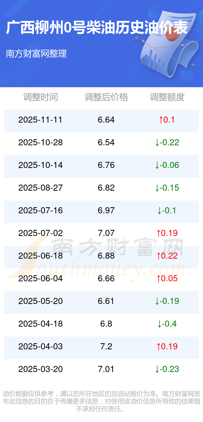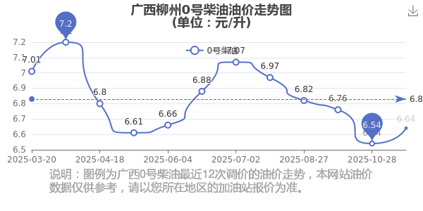 11月20日广西柳州0号柴油的最新价格(11月11日调整后的价格):6.64元/升,相对上次调整上涨了0.1元。