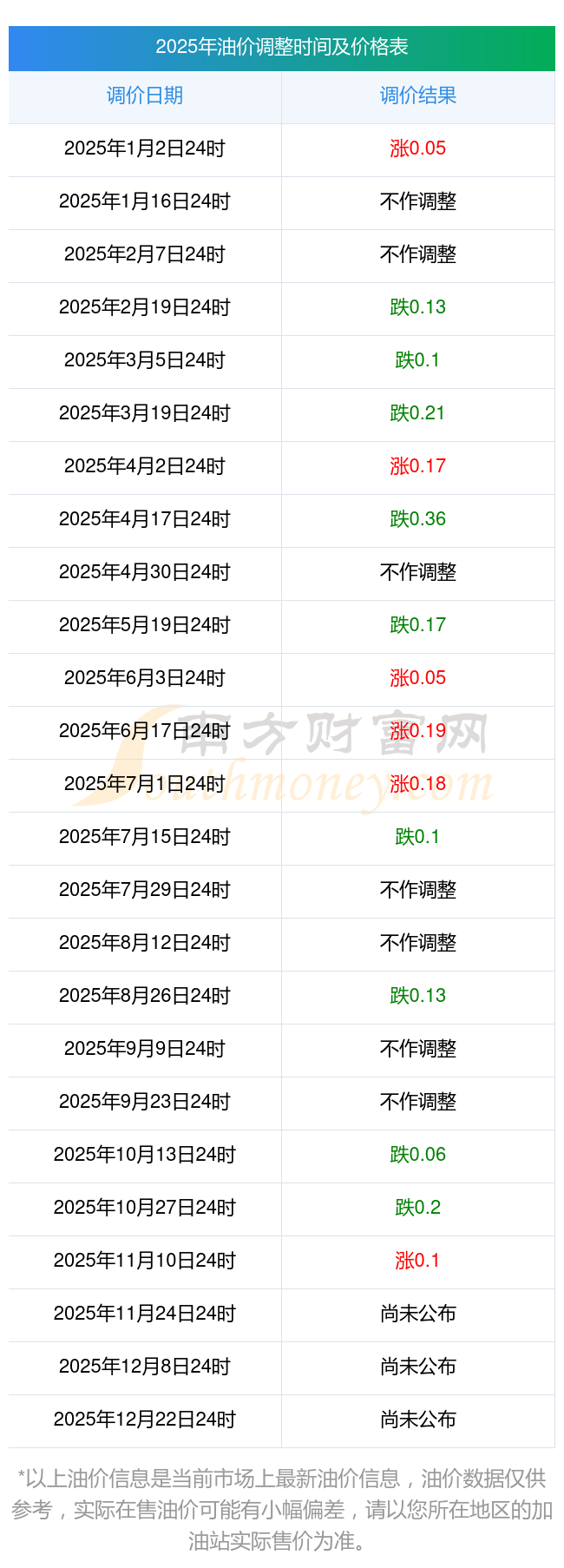 油价调整最新消息:下一轮油价调整时间11月24日24时。11月20日的??州区汽油、柴油每升最新价格(调整时间为11月11日):92号汽油为6.83元,升了0.1元,升幅达1.49%;95号汽油为7.22元,升了0.11元,升幅达1.55%;89号汽油为6.45元,升了0.1元,升幅达1.58%;0号柴油为6.48元,升了0.1元,升幅达1.57%。