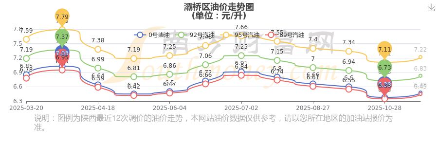 11月20日灞桥区汽油、柴油价格是多少钱一升?11月11日调整后,92号汽油为6.83元,涨了0.1元,涨幅达1.49%;95号汽油为7.22元,涨了0.11元,涨幅达1.55%;89号汽油为6.45元,涨了0.1元,涨幅达1.58%;0号柴油为6.48元,涨了0.1元,涨幅达1.57%。