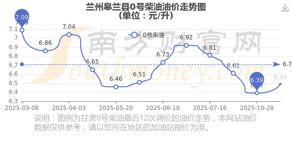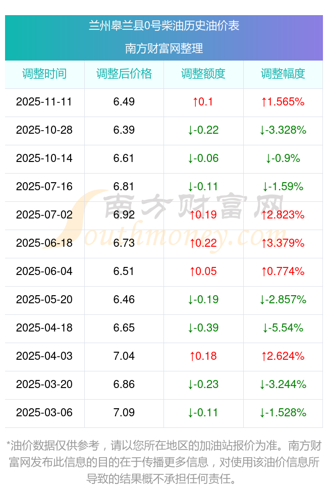 兰州皋兰县0号柴油11月20日最新价格为6.49元/升,为11月11日油价调整后的价格,相对上次调整时间10月28日的油价6.39元每升,升了0.1元,升1.565%。