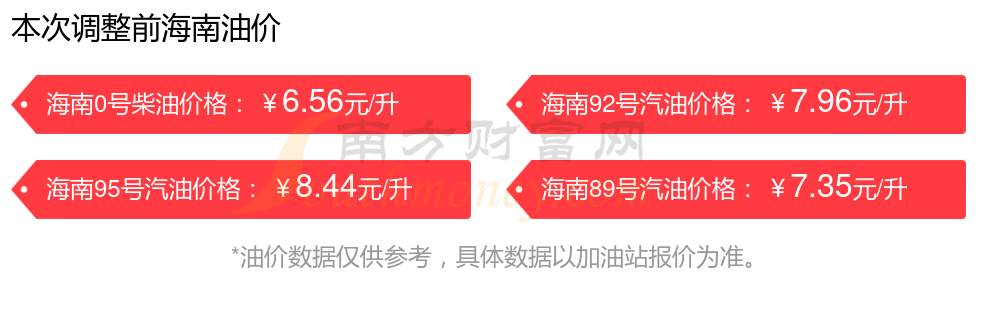 海南汽油、柴油11月20日每升最新价格为:调整时间为11月11日,92号汽油为8.06元,增了0.1元;95号汽油为8.55元,增了0.11元;89号汽油为7.44元,增了0.09;0号柴油为6.67元,增了0.11元。