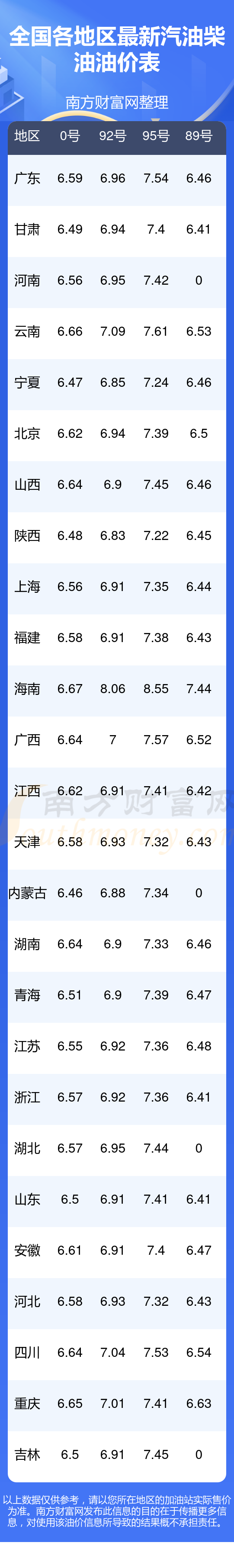 以上数据仅供参考,请以您所在地区的加油站实际售价为准。开云手机web版登录入口发布此信息的目的在于传播更多信息,对使用该油价信息所导致的结果概不承担责任。