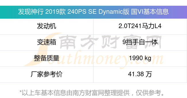 在动力上,发现神行 2019款 240PS SE Dynamic版 国VI配备的是一台2.0T241马力L4涡轮增压发动机,匹配的是9挡手自一体自动档变速箱,燃料形式为汽油,常规整备质量1990kg,厂家参考价41.38万元。