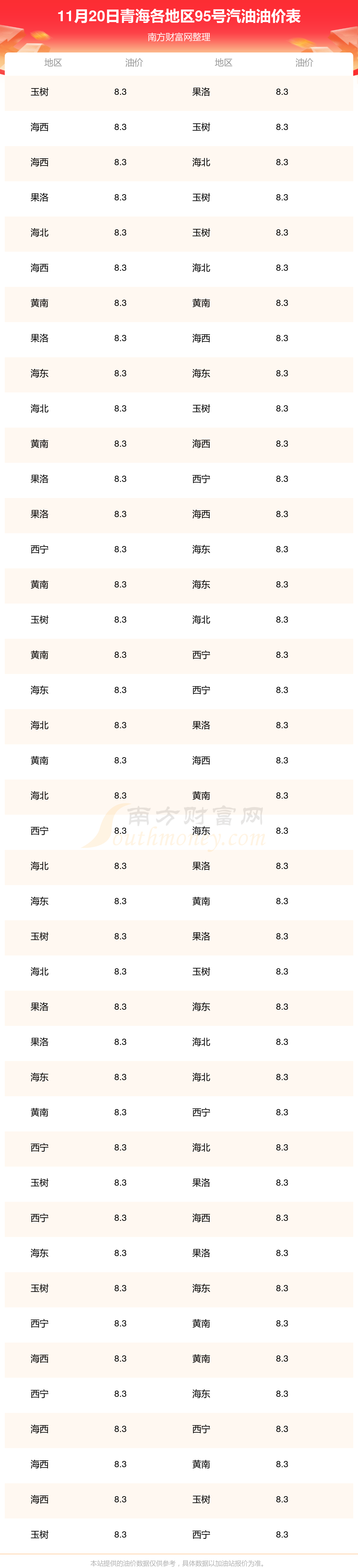 11月20日青海95号汽油价格为7.39元每升,本次调整时间为11月11日,相对上次增了0.1元,增1.372%。
