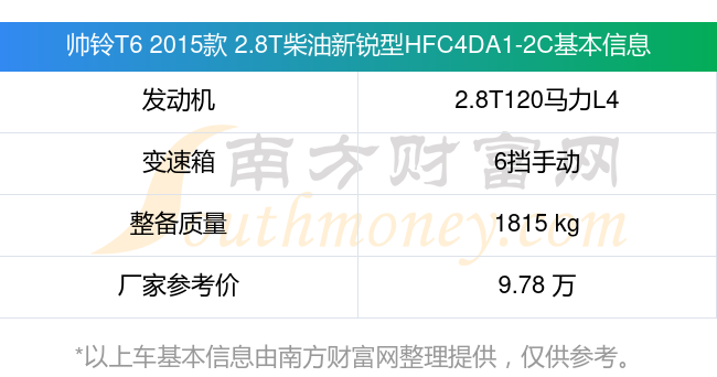 帅铃T6 2015款 2.8T柴油新锐型HFC4DA1-2C动力上搭载的是一台2.8T120马力L4涡轮增压发动机,匹配6挡手动挡变速箱,燃料形式为柴油,常规整备质量1815kg,厂家参考价9.78万元。