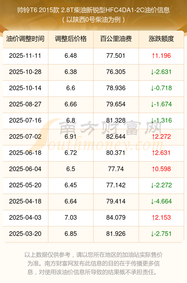 依照11月11日0号柴油最新调整价格6.48元/升来计算(以陕西为例),该车型百公里的平均油费是77.501元,依照上一轮10月28日调整价格6.38元/升来计算,百公里的平均油费是76.305元,对比上一轮多花1.196元,下一轮的油价调整时间11月24日24时。
