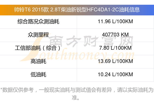 根据多位车主实测得出数据,该车型低油耗为10.24升/百公里,高油耗为13.69升/百公里,综合路况众测油耗为11.96升/百公里,工信部综合油耗为7.80升/百公里。