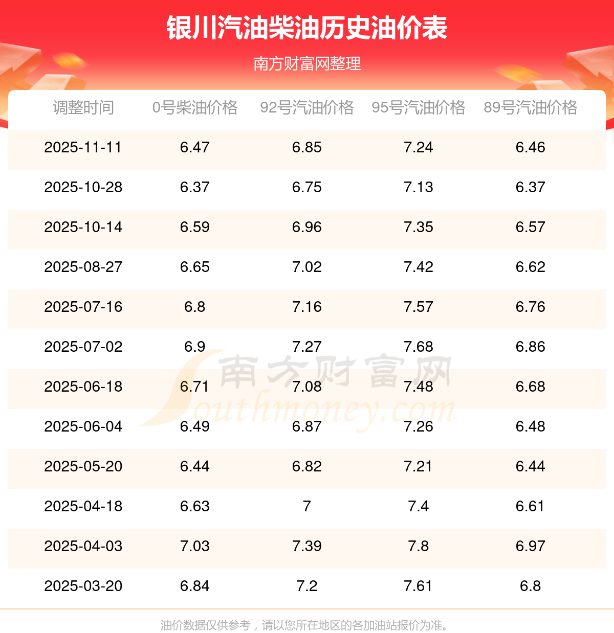 油价调整最新消息:银川汽油、柴油11月20日每升的价格(油价调整时间11月11日):92号汽油6.85元;95号汽油7.24元;89号汽油6.46元;0号柴油6.47元。银川下一轮油价调整时间11月24日24时,距离现在还有4.52天。