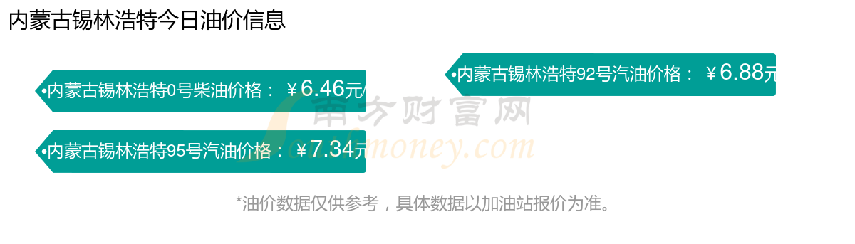 11月20日,内蒙古锡林浩特汽油、柴油每升最新价格:本轮的油价调整时间是11月11日,92号汽油为6.88元,涨了0.1元,涨幅达1.48%;95号汽油为7.34元,涨了0.1元,涨幅达1.38%;0号柴油为6.46元,涨了0.1元,涨幅达1.57%。