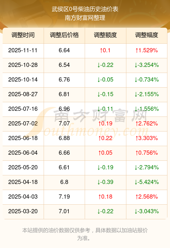 11月20日武侯区0号柴油价格查询:每升6.64元(11月11日油价调整后的价格),相对上次调整时间10月28日的油价6.54元每升,上升了0.1元,上升1.529%。