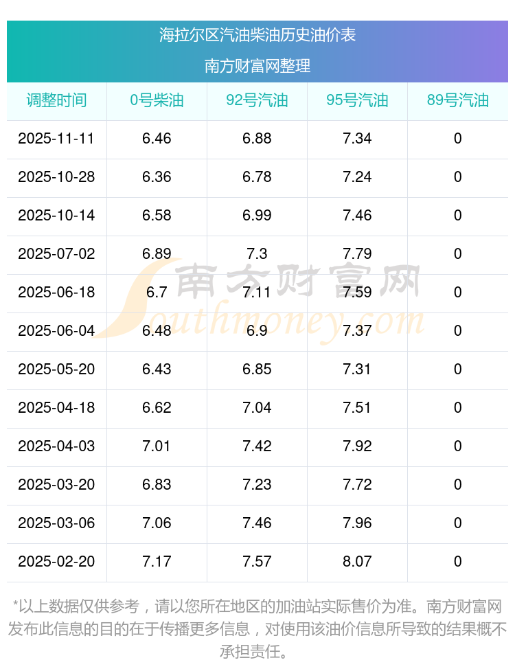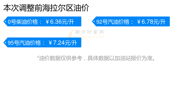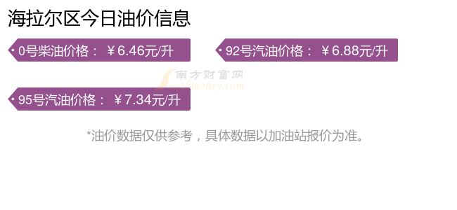 海拉尔区汽油、柴油11月20日每升的价格为(油价调整时间是11月11日):92号汽油6.88元;95号汽油7.34元;0号柴油6.46元。