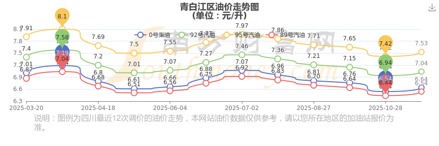 11月20日青白江区汽油、柴油价格是11月11日调整后的价格,每升价格具体为:92号汽油为7.04元,上涨了0.1元,上涨幅达1.44%;95号汽油为7.53元,上涨了0.11元,上涨幅达1.48%;89号汽油为6.54元,上涨了0.1元,上涨幅达1.55%;0号柴油为6.64元,上涨了0.1元,上涨幅达1.53%。