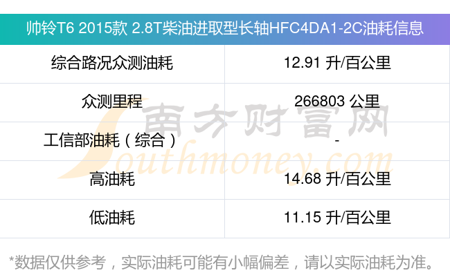 根据车主实测数据,该车型低油耗为11.15升每百公里,高油耗为14.68升每百公里,综合路况众测油耗为12.91升每百公里。
