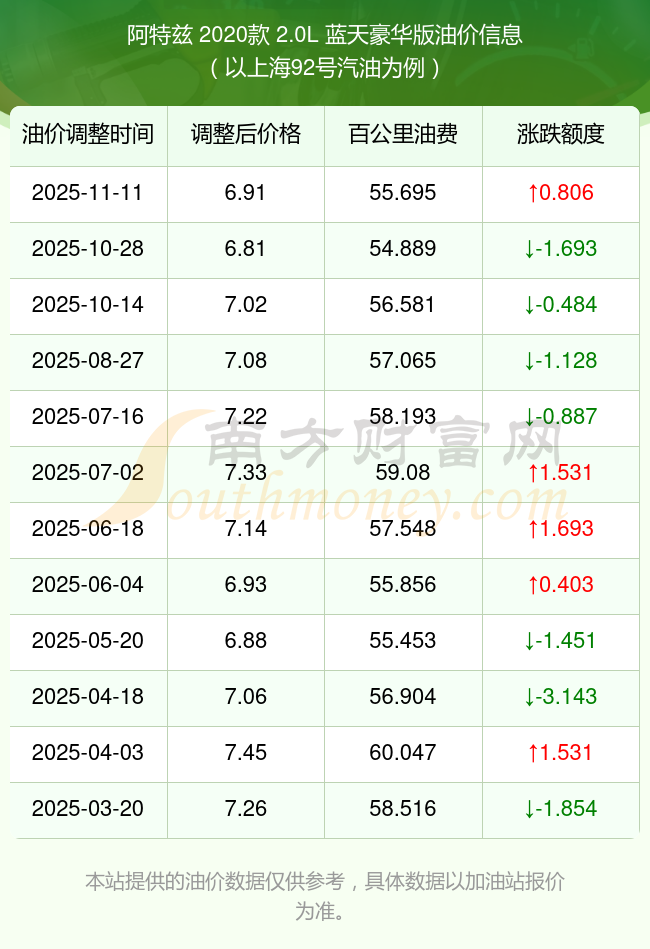 按11月11日92号汽油最新调整价格6.91元每升来计算(以上海为例),该车型百公里平均油费为55.695元,按上一轮10月28日调整价格6.81元每升来计算,百公里平均油费为54.889元,对比上一轮多花0.806元,下一轮油价调整时间为11月24日24时。