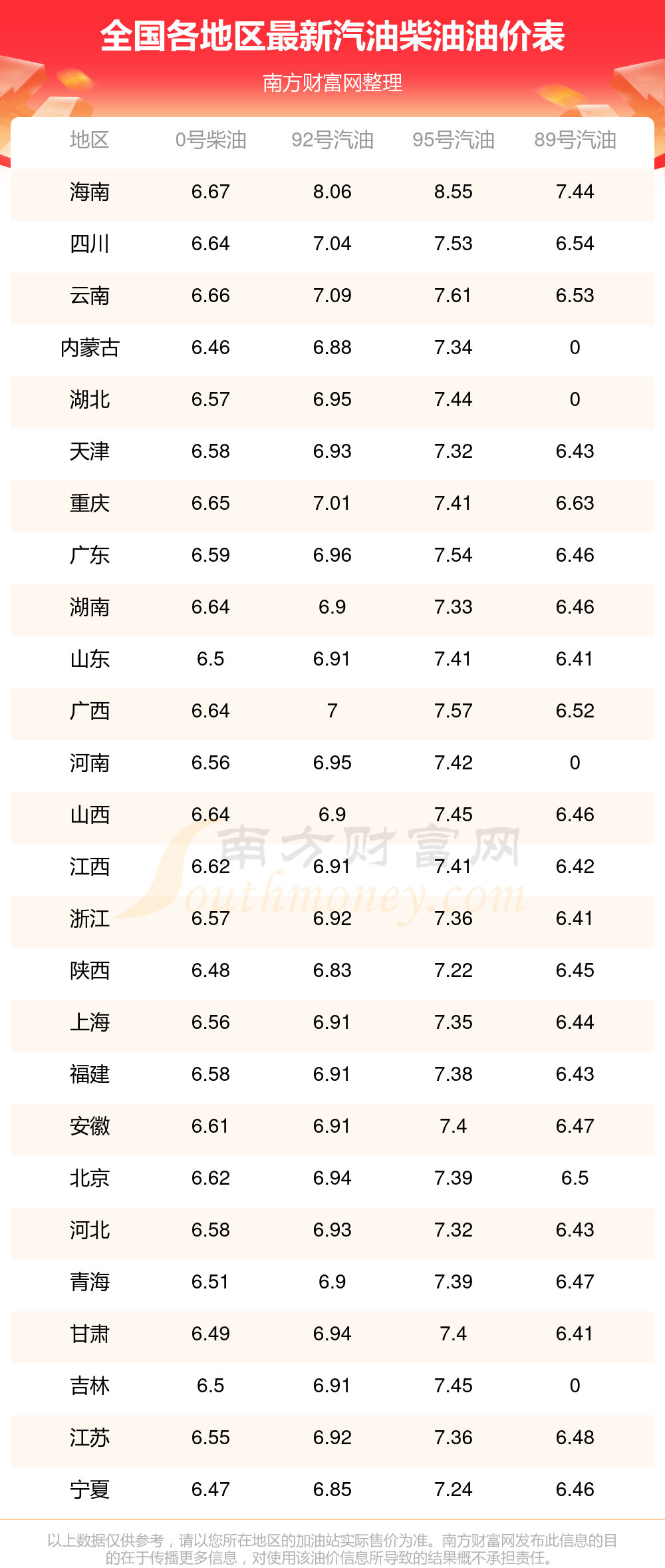 油价调整最新消息:油价最新调整时间为11月11日 ,全国92号汽油最新平均价格为:7元每升,其中,最高为海南,价格为8.06元/升,最低为陕西,价格为6.83元/升。全国95号汽油最新平均价格为:7元每升,其中,最高为海南,价格为8.55元/升,最低为陕西,价格为7.22元/升。全国0号柴油最新平均价格为:7元每升,其中,最高为海南,价格为6.67元/升,最低为内蒙古,价格为6.46元/升。全国89号汽油最新平均价格为:7元每升,其中,最高为海南,价格为7.44元/升,最低为浙江,价格为6.41元/升。下一轮汽油价格调整时间11月24日24时,距离现在还有4.5天。
