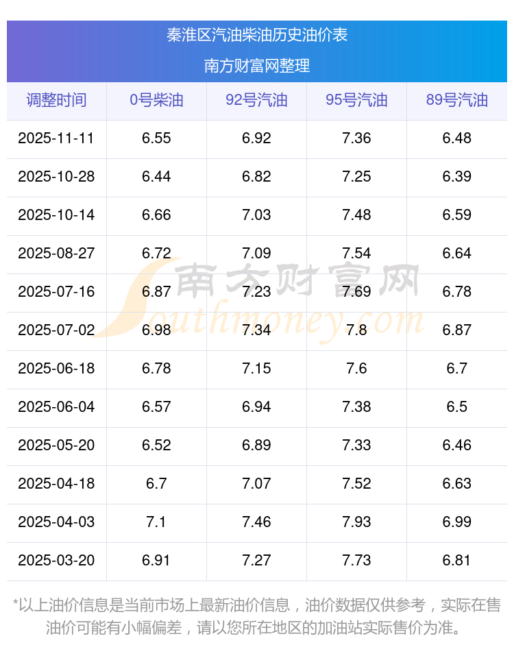 11月20日,秦淮区汽油、柴油每升最新价格为(11月11日调整后的价格):92号汽油为6.92元,涨了0.1元,涨幅达1.47%;95号汽油为7.36元,涨了0.11元,涨幅达1.52%;89号汽油为6.48元,涨了0.09元,涨幅达1.41%;0号柴油为6.55元,涨了0.11元,涨幅达1.71%。
