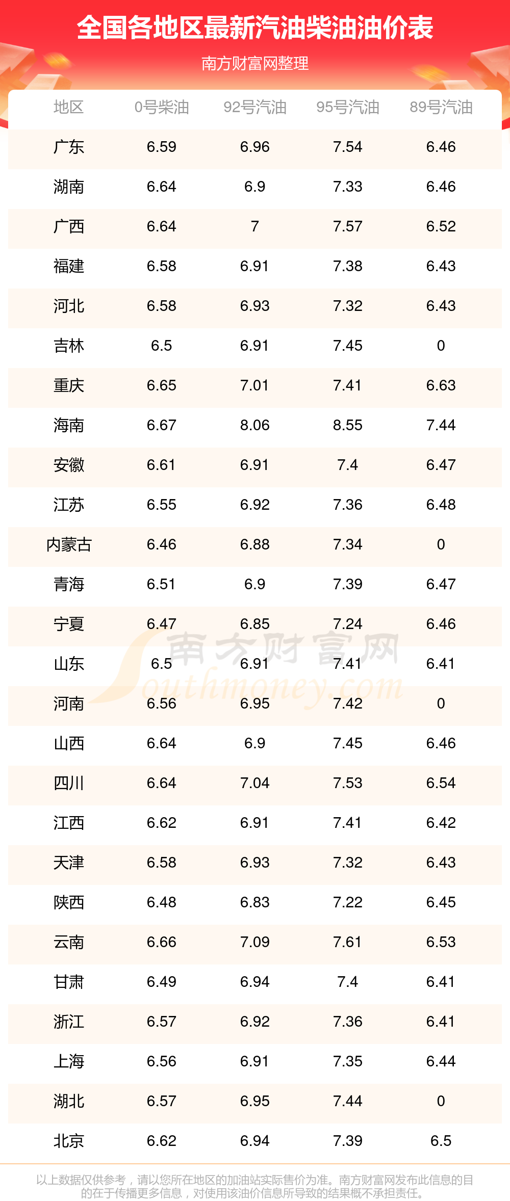 2025年11月20日全国油价调整及最新汽油价格表