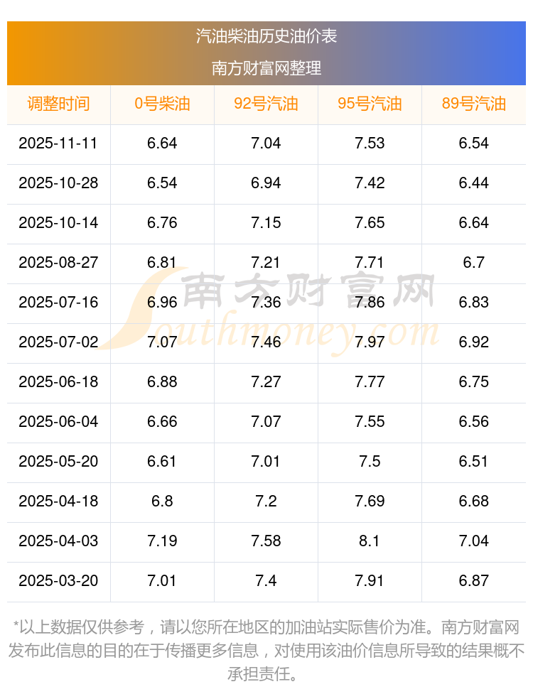 11月20日宜宾92号汽油的最新价格:宜宾92号汽油7.04元/升(根据11月11日调整后的价格),相对上次调整时间10月28日的油价6.94元每升,涨了0.1元,涨1.441%。下一轮油价调整时间11月24日24时,距离现在还有4.48天。
