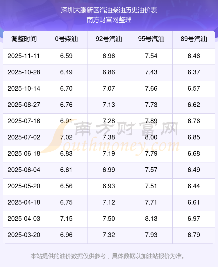 11月20日深圳大鹏新区汽油、柴油每升的价格为:92号汽油为6.96元,涨了0.1元;95号汽油为7.54元,涨了0.11元;89号汽油为6.46元,涨了0.09元;0号柴油为6.59元,涨了0.1元,本轮油价的调整时间为11月11日。