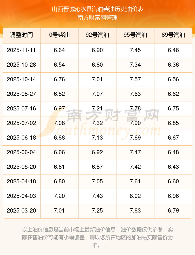 2025年山西晋城沁水县油价调整时间表