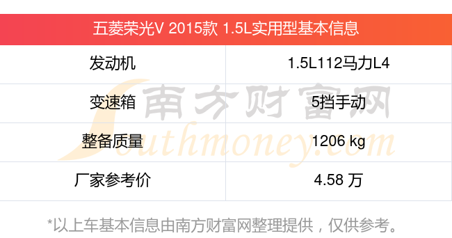 五菱荣光V 2015款 1.5L实用型动力方面,搭载的是一台1.5L112马力L4自然吸气发动机,匹配5挡手动挡变速箱,燃料形式为汽油,常规整备质量1206kg,厂家参考价4.58万元。