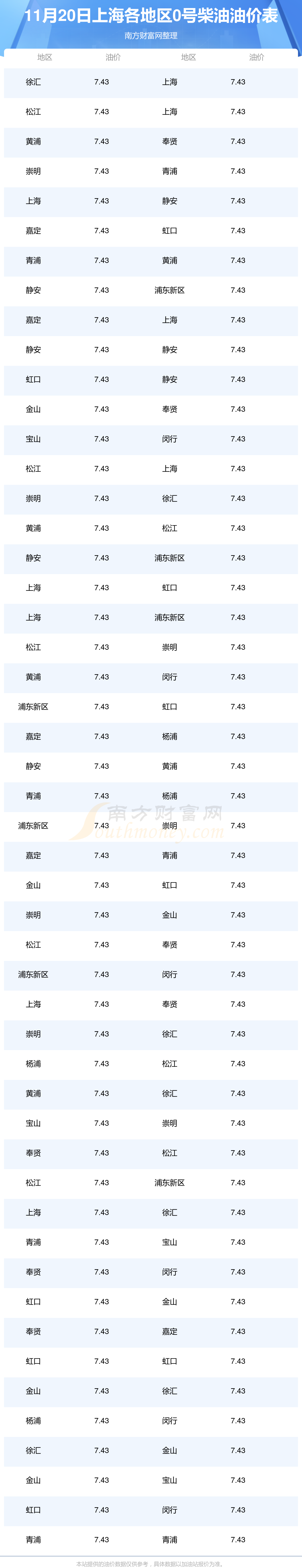 11月20日,上海0号柴油的价格是6.56元每升,本次的调整时间为11月11日,对比上次的调整上调了0.11元,上调1.705%,下次调整时间为11月24日24时,还有4.46天。