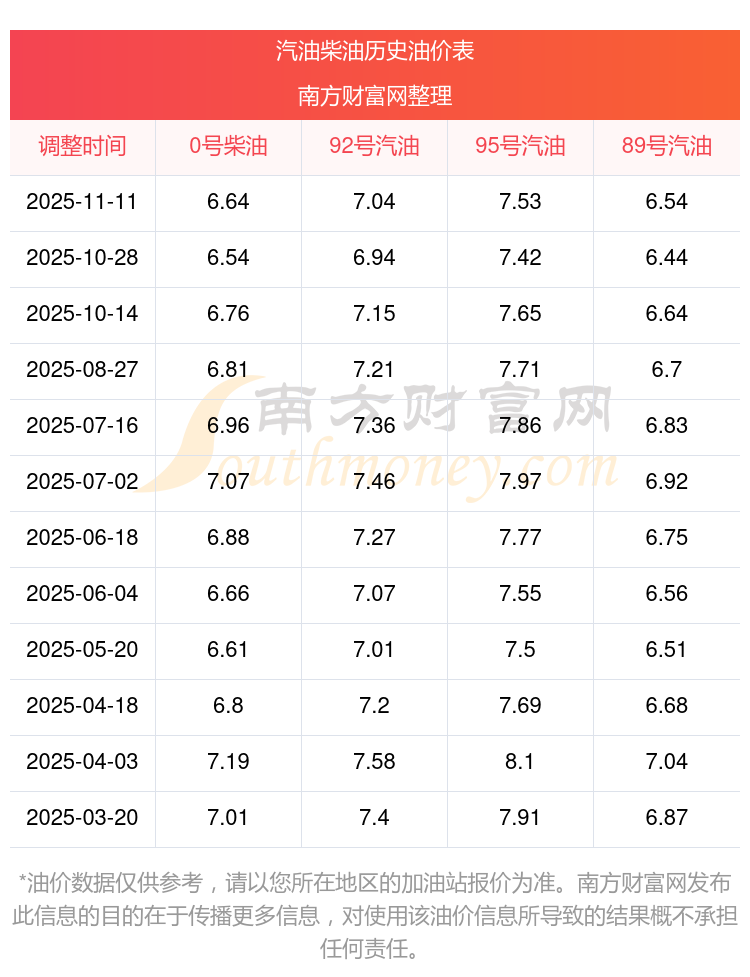 四川阿坝95号汽油11月20日的价格为每升7.53元,本次油价的调整时间11月11日,对比上次油价调整时间10月28日的价格7.42元/升,共上升了0.11元,上升幅达1.482%。下一轮油价调整时间11月24日24时,距离现在还有4.46天。