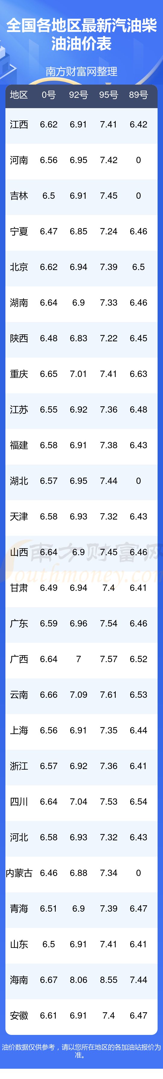 2025年11月20日全国油价调整及最新汽油价格表