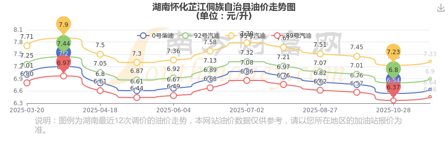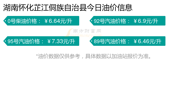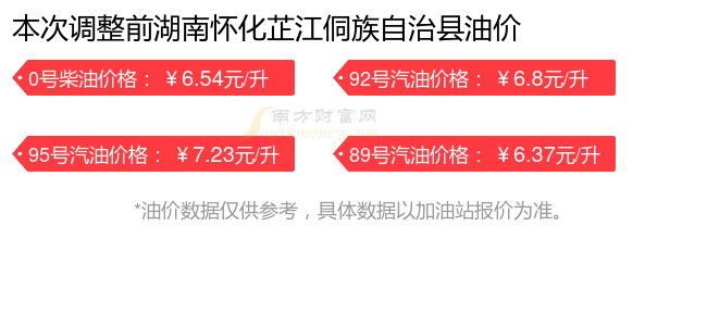 湖南??化芷江侗族自治县汽油、柴油11月20日的价格是多少钱一升?详情为:92号汽油为6.9元,增了0.1元;95号汽油为7.33元,增了0.11元;89号汽油为6.46元,增了0.09元;0号柴油为6.64元,增了0.1元,本次油价的调整时间为11月11日。