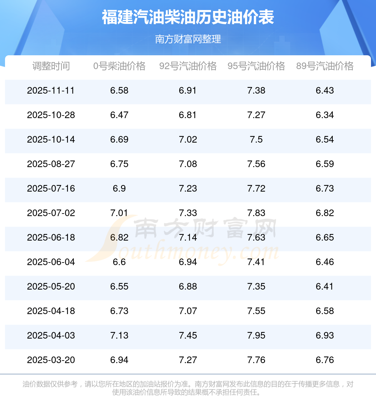 11月20日,福建89号汽油的价格是6.43元每升,本次的调整时间为11月11日,对比上次的调整上调了0.09元,上调1.42%,11月24日24时为下一轮油价调整时间,还有4.43天。