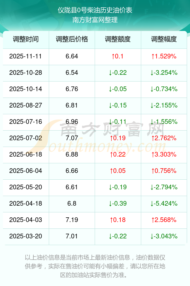 仪陇县0号柴油11月20日最新价格为6.64元/升,调整时间为11月11日,相对上次调整上涨了0.1元,上涨1.529%。
