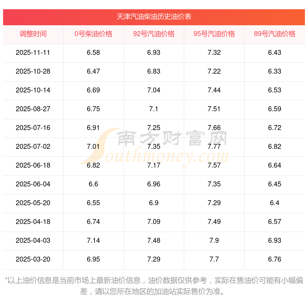 11月20日,天津92号汽油的价格是6.93元每升,本次的调整时间为11月11日,对比上次的调整上升了0.1元,上升1.464%,11月24日24时为下一轮油价调整时间,还有4.41天。