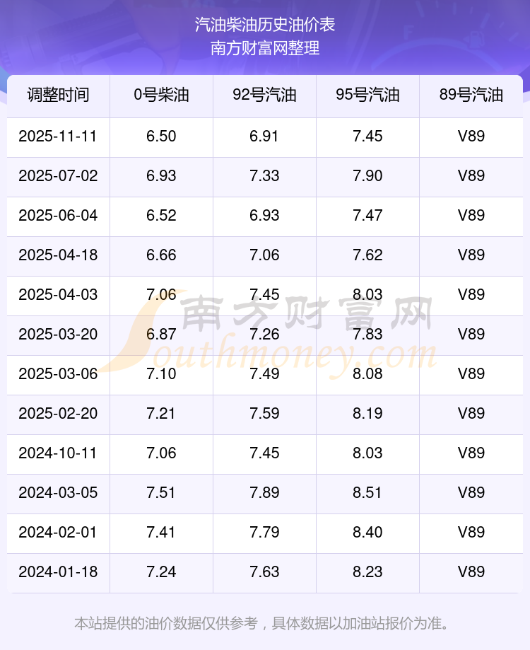 11月20日四平92号汽油的价格是6.91元/升,油价于11月11日调整,相对上次调整时间7月2日的油价6.8元每升,共上升了0.11元,上升幅达1.618%。下一轮油价调整时间11月24日24时,距离现在还有4.41天。
