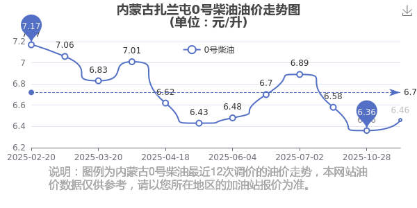 内蒙古扎兰屯汽油、柴油11月20日每升最新价格为:92号汽油为6.88元;95号汽油为7.34元;0号柴油为6.46元,调整时间为11月11日。