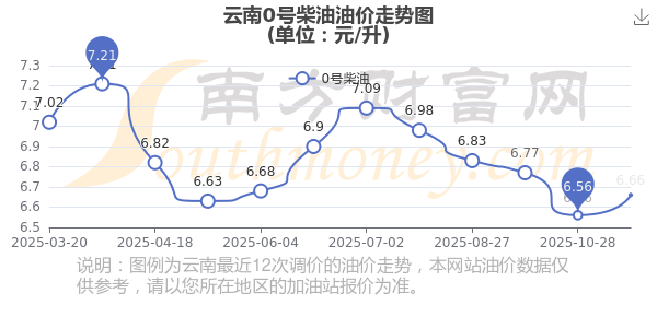 云南0号柴油11月20日最新价格是6.66元每升,本轮油价调整时间是11月11日,对比上次共上调了0.1元,上调1.524%。