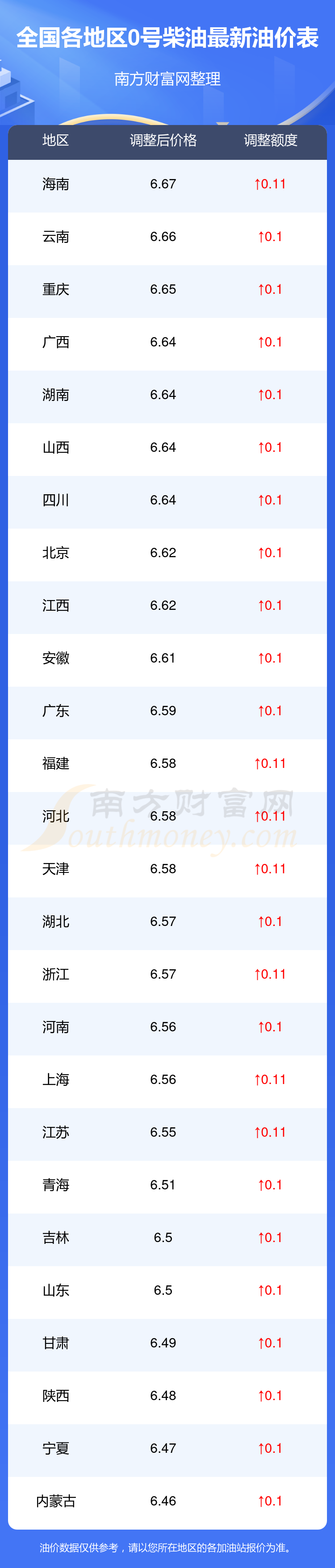 11月20日,全国0号柴油最新平均价格为7元每升(根据11月11日油价调整后计算),其中全国0号柴油最低为内蒙古,价格6.46元/升,0号柴油最高为海南,价格6.67元/升。