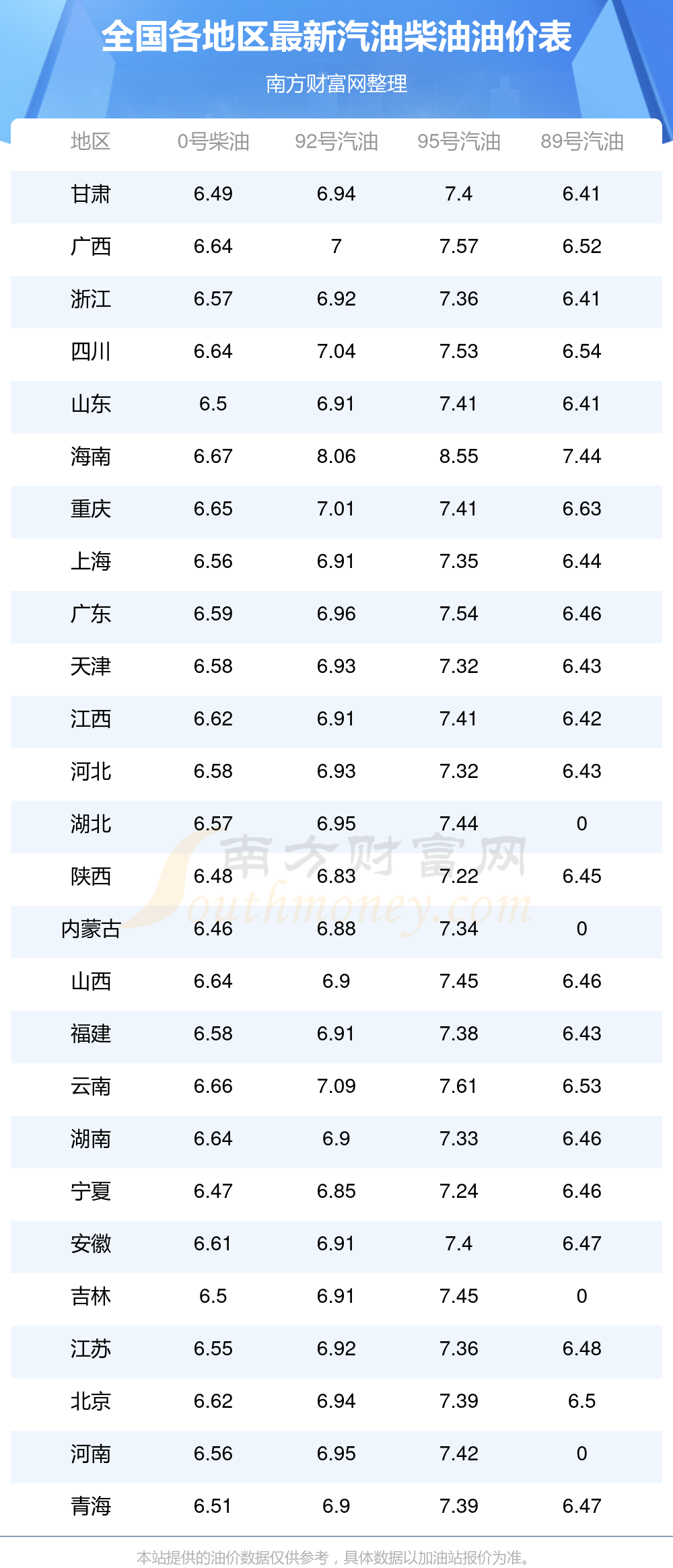 全国0号柴油11月20日的最新价格是11月11日油价调整后的价格,当中,平均价格为7元/升,最低的是内蒙古,价格6.46元/升,最高的是海南,价格6.67元/升。下一轮油价调整时间11月24日24时,距离现在还有4.39天。