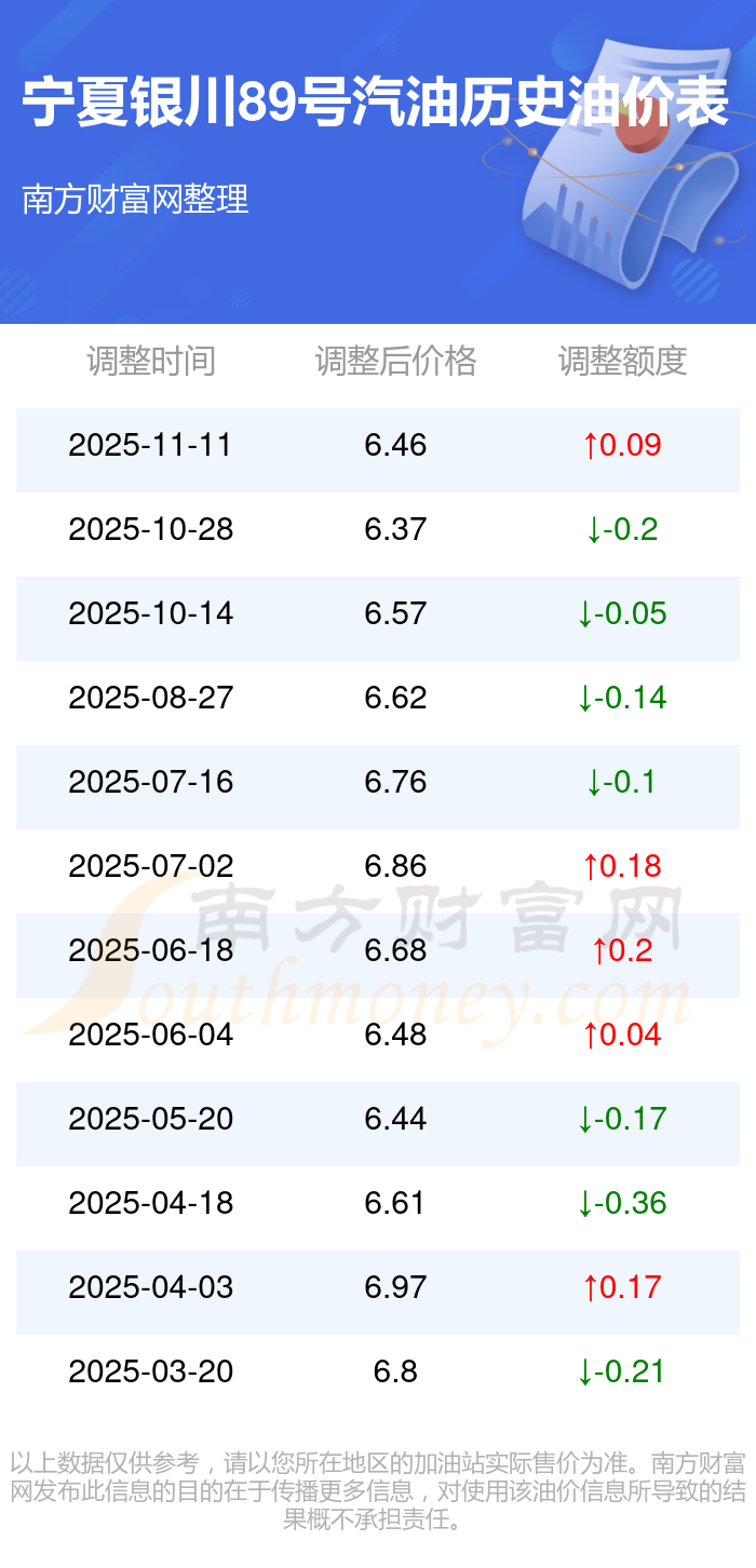 宁夏银川89号汽油11月20日的最新价格:11月11日油价调整后,宁夏银川89号汽油6.46元/升,相对上次调整时间10月28日的油价6.37元每升,涨了0.09元,涨1.413%。
