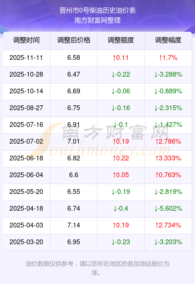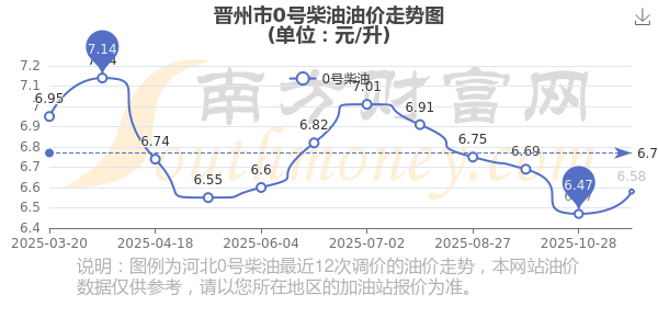 11月20日晋州市0号柴油的价格为11月11日油价调整后的价格,每升6.58元,对比上一轮油价调整时间10月28日的价格6.47元每升,上调了0.11元,上调幅达1.7%。