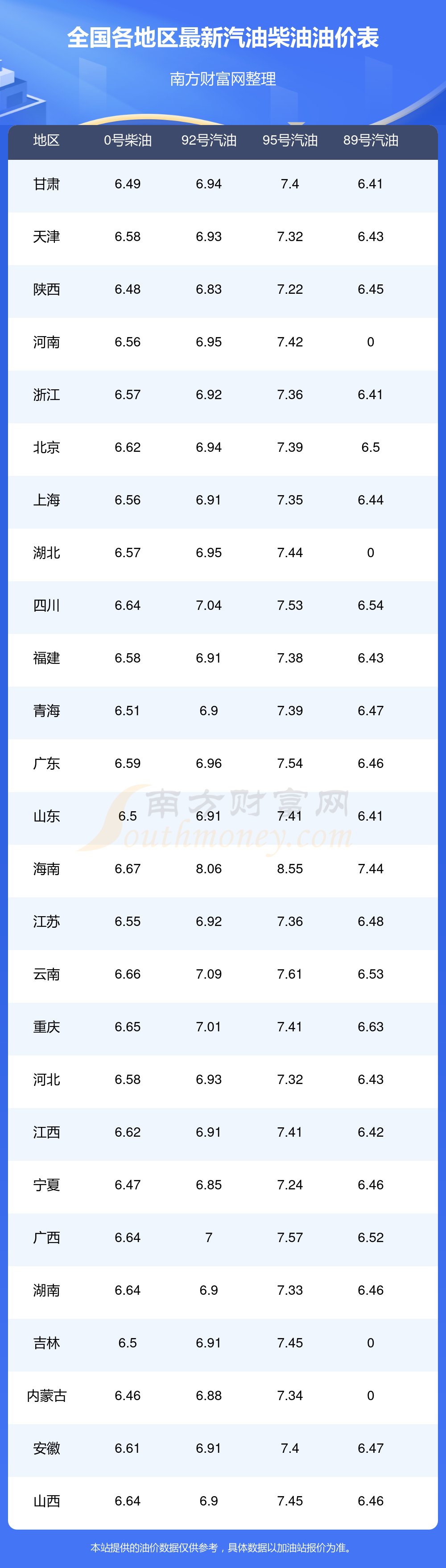 以上油价信息是当前市场上最新油价信息,油价数据仅供参考,实际在售油价可能有小幅偏差,请以您所在地区的加油站实际售价为准。